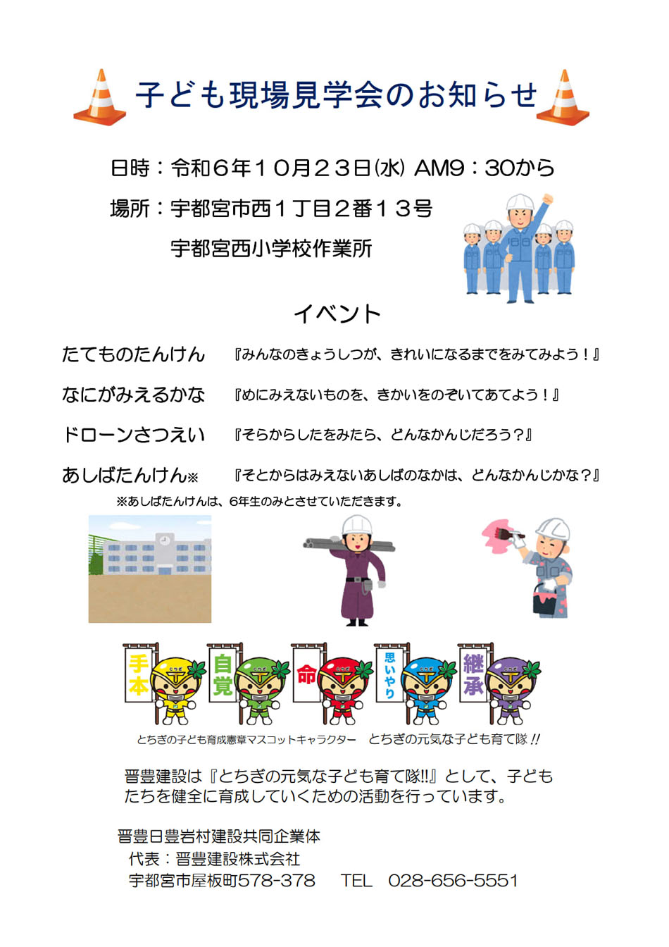 栃木県林業大学校(仮称)屋内実習棟新築工事作業所で、高所作業車の体験、建物の出来るまでの体験見学などを行いました、こどもたちに好評でした。