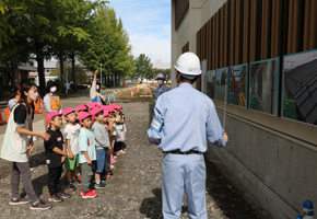 宮原運動公園野球場その他解体工事作業所で、建設機械のデモンストレーション等の見学を行い、こどもたちに好評でした。