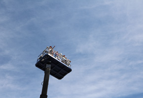 横断歩道橋新設工事作業所で、高所作業車の体験、歩道橋の体験見学やドローン映像の体験行い、こどもたちに好評でした。