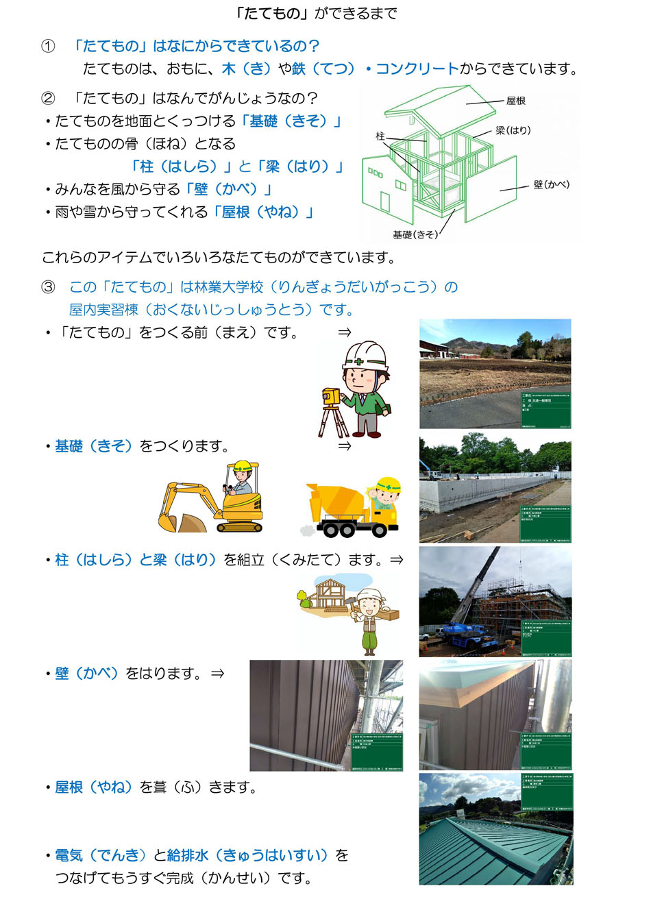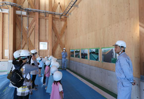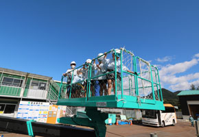 栃木県林業大学校(仮称)屋内実習棟新築工事作業所で、高所作業車の体験、建物の出来るまでの体験見学などを行いました、こどもたちに好評でした。