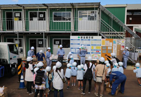 宝木職員住宅解体工事作業所で、建設機械のデモンストレーションや高所作業車の体験を行い、こどもたちに好評でした。
